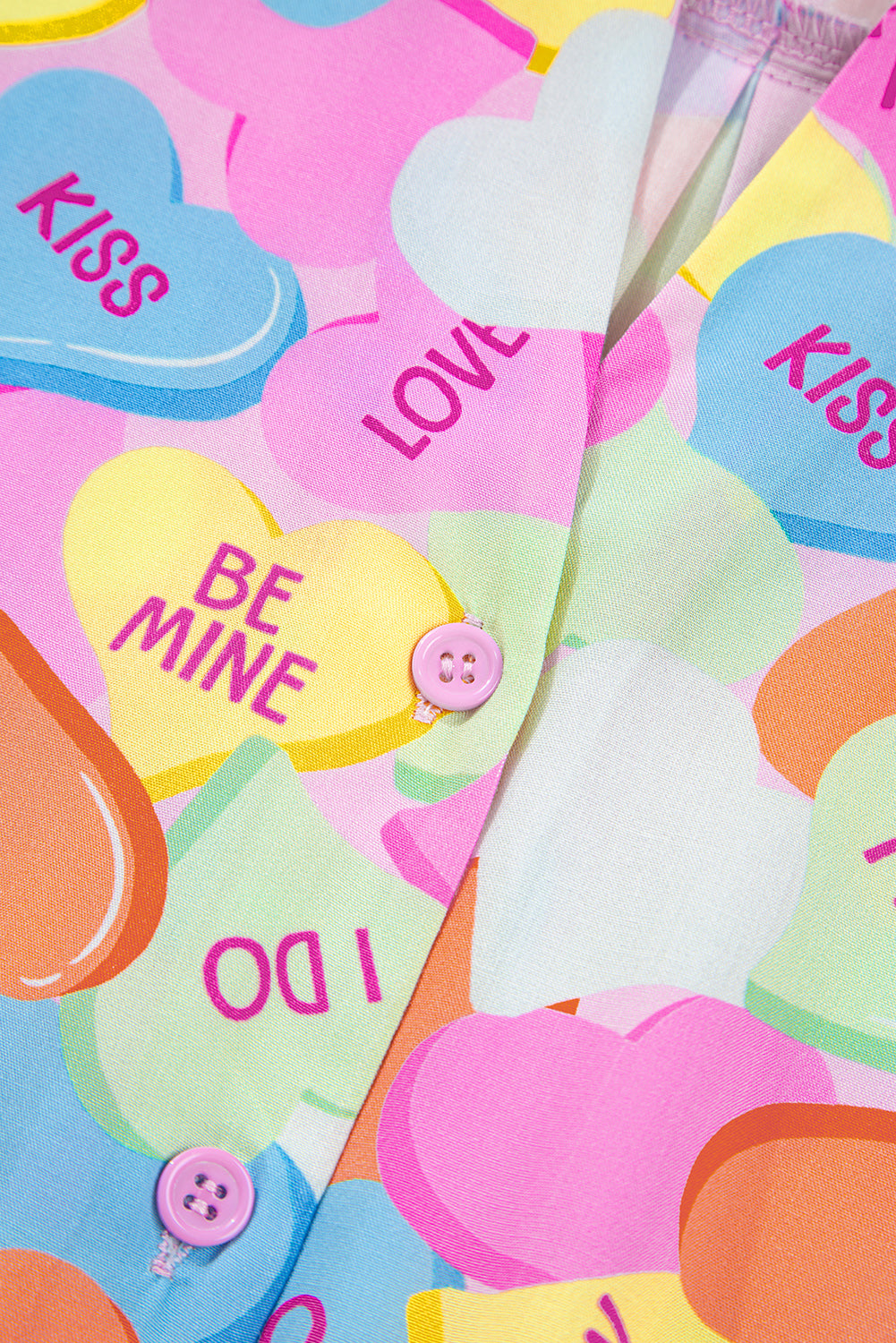 - Valentines Day pajama set with candy heart print adds sweet charm to sleepwear style.